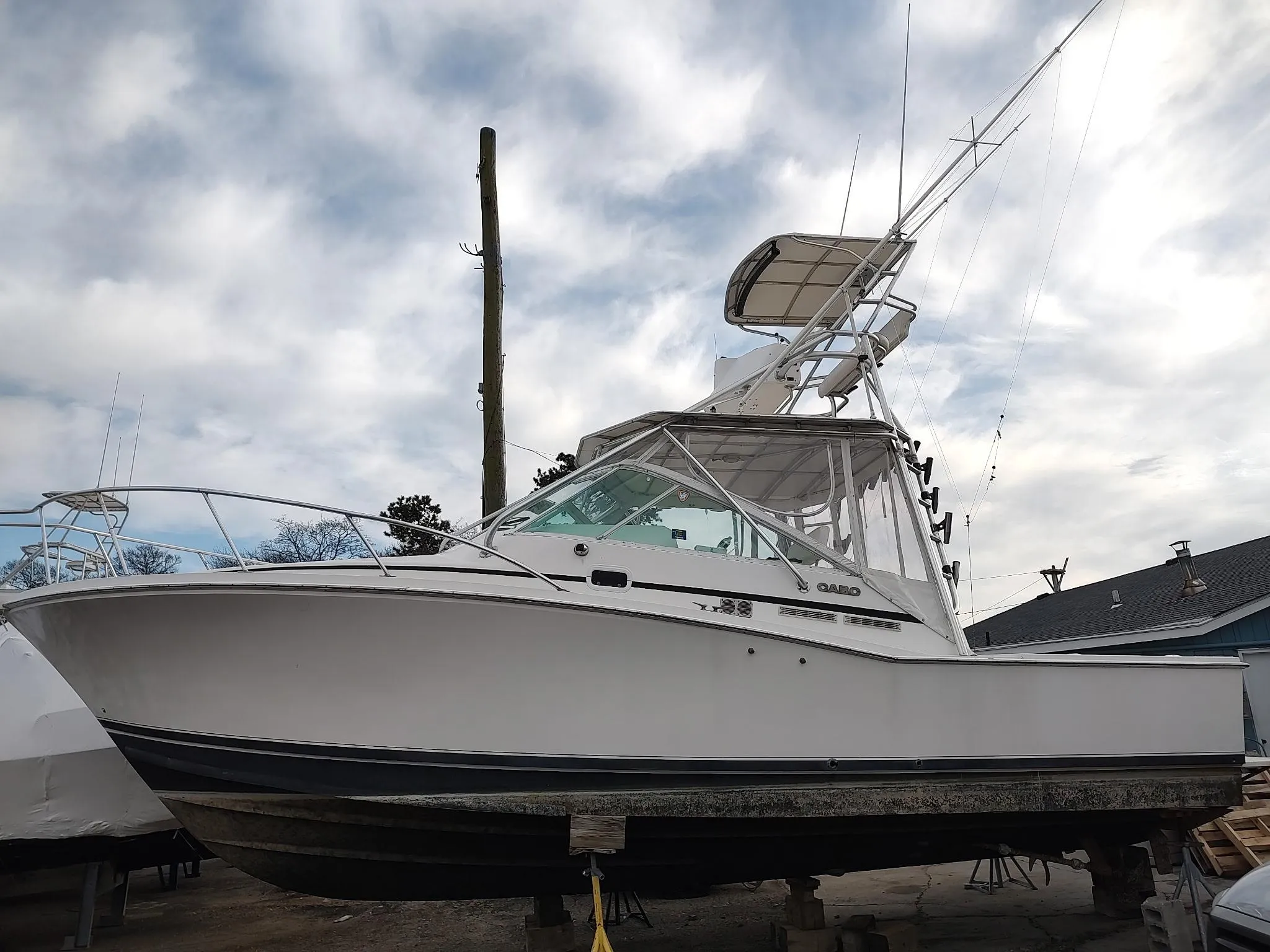 Cabo 31 Express Specifications - Standard Equipment Hull - Molded fiberglass construction using premium vinylester resin and biaxial stitched fabric reinforcement - Solid fiberglass bottom construction - Core construction from upper chine to sheer - Premium quality molded-in white gelcoat finish - Boot striping (choice of colors) - Bottom paint complete preparation - 2 coats epoxy, 2 coats antifouling paint, black standard - Stainless steel rub strip on face of white high-density rub rail - Trim tabs, fully recessed Deck - Molded fiberglass using premium polyester resin, biaxial stitched fabric reinforcements and core construction - Premium quality molded-in white gelcoat finish - Molded-in non-skid surface - Bow platform of integral molded fiberglass - Recessed custom stainless steel anchor roller assembly - Custom deck rails, aluminum - Bow cleats, 10-inch stainless steel - Springline cleats, 10-inch stainless steel - Stern cleats, 10-inch stainless steel - Stern hawse pipes, stainless steel - Windshield, heavy duty welded aluminum construction, white painted finish, including electrically-actuated center vent - Two windshield wipers, self-parking - Aluminum reinforcing plate installed for mounting fighting chair Cockpit - Icebox, starboard side fitted with custom gasketed lid, gas spring actuator - Bait prep center, portside, includes sink, rigging board, fitted with custom lid, gas spring actuator, and triple storage - Fish box, large capacity, built into the transom, with large over board drain - Fish box, large capacity, removable, built into cockpit sole - Gaff racks, port and starboard - Rod holders (4) - Self-bailing cockpit scuppers - Step - storage boxes, port and starboard - Transom door with top gate, extreme duty polished stainless hardware - Washdown, freshwater, portside - Washdown, salt water with hose and pistol grip nozzle, starboard side Helm Deck - Molded fiberglass helm deck, hydraulically lifted with cockpit control unit - Storage cabinet with tackle drawers - Helm console, integrally molded - Helm seat, adjustable bench - Settee portside - Sliding companionway door, white translucent acrylic with latch, lock and safety stop Helm Console - Compass with light, flush-mounted - Complete custom engine instrument panel with audible warning system - Custom switch panel - Dual-lever engine controls - Fire and bilge water level alarms, audible - Aluminum helm wheel - Canvas console cover Mechanical - Coast Guard approved metal braided fuel lines - Bilge has white gelcoated finish - Bilge pumps, three 12V automatic - manual - Emergency bilge suction valve on one engine - Bonding system with transom zinc plate - Double hose clamps on all hose fittings where possible, stainless steel - Double constant torque stainless steel clamps on exhaust hoses - Engine alarm system - Engine hour meters (2) - Engine room sound insulation, high-density barrier - foam sandwich, silver Mylar faced - Fiberglass fuel tank - Freshwater cooling on main engines - Fuel filters with water separators on main engines and optional generator - Fire extinguishing system, automatic - High water bilge alarm - Holding tank, macerator, overboard and dockside discharge - Water heater, stainless steel - Hydraulic engine controls (Hynautic) - Mufflers, fiberglass with large backwash surge chambers - Propeller shafts, high-strength stainless steel, 1.75 inch diameter, double taper couplers - Propellers, 4-blade Nibral (diesel) - Rudders, high-strength bronze - Stuffing boxes, dripless lip seal type - Seacocks, UL approved for marine application, bronze, fitted on all through-hulls below waterline - Bronze high-speed water intake scoops with integral seawater strainers Electrical - Custom AC electrical distribution panel with line voltage and load meters, reverse polarity light and main breakers that trip with reverse polarity - Custom DC electrical distribution panel with battery voltage and load meters - Circuit breaker protection throughout - Battery paralleling switch, vapor-proof - Battery on - off switches, vapor-proof - Batteries (3), heavy duty 30 AH with battery boxes - Bonded electrical system - Converter - battery charger, automatic - Engine room lighting, 12V - Horn, recessed dual air trumpet, shipped uninstalled - Navigation lights, shipped uninstalled to mount on arch, hardtop or tower - 30 amp shorepower with 50-foot shore cord Main Cabin - Access hatch to bilge - Lighting is recessed halogen - L-shaped lounge converts to upper and lower sleeping berths - Interior teak superbly joined and finished in satin varnish - Positive latches used on cabinet doors and drawers - Removable deep pile carpet - Built-in TV with cable hook-up - 110 volt duplex outlet, GFI protected Galley - Cook top, one-burner electric, recessed with Corian cover - Corian countertop (standard Aurora) with custom Corian sea rails - Countertop lighting - recessed halogen - Microwave oven - Positive latches used on cabinet doors and drawers - Refrigerator, AC-DC with top freezer - Sink, deep single, polished stainless steel - Storage compartments - 110 volt duplex outlet, GFI protected Forward Stateroom - Access to anchor rope locker - V-Berth: dinette convertible to large double bed, storage below - Positive latches used on cabinet doors and drawers - Recessed halogen lights - Deck hatch opening - Rod storage cabinets port and starboard; total 8 rods Head Compartment - Custom vanity with storage cabinet and mirror - Head, electric - Lighting is 12 volt recessed halogen - Positive latches used on cabinet doors and drawers - Vanity sink - Shower, handheld with automatic shower sump pump - Toiletry storage cabinet, with sliding mirror doors - Towel rack - Rod storage rack for 3 rods Safety Equipment - Anchor, 20-foot chain, 250-foot rode, life jackets, throwable PFD, fire extinguisher, docklines, fenders, distress signaling device, flashlight, emergency horn, first aid kit Cabo 31 Express Optional Equipment Diesel - Twin Caterpillar 3