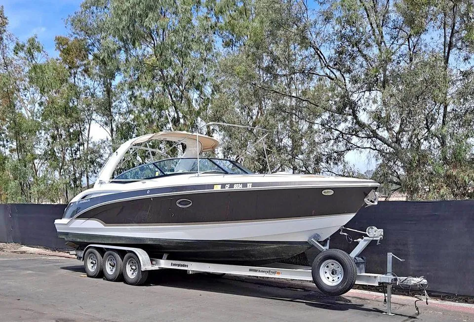 Formula pushes all the right buttons with the 31 Bowrider. Designed to spend the day on the water, the U-shaped cockpit lounge with stowable table easily converts to a sun pad by adding the filler cushions. The forward portside lounge provides dedicated dive tank storage underneath, and the molded wet bar includes a stainless sink, Corian countertop, and a refrigerator. In-floor wakeboard and ski storage is also provided. To port, the lockable head compartment features a VacuFlush toilet and a sink with Corian counter. The 310’s aft-facing transom lounge also extends to a sun pad for relaxing at anchor. Note the large transom compartment for storing two fenders and assorted gear. Her twin 320hp MerCruisers will get you and 12 of your friends up to 40kn with ease.