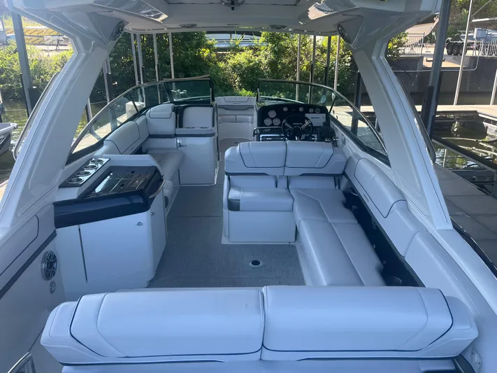 The Formula Bowrider 310 is roomy and comfortable with a classic interior. As our flagship bowrider, this is an upscale sport boat with impeccable performance that will be sure to impress. It is 31’ with a beam of 9’6” and includes plenty of seating and amenities. This 2023 is equipped with T-MerCruiser 6.2L MPI's & Bravo 3's. Comes with a Hard Top, SureShade, Extended Platform, Electric Windlass, JL Audio stereo Upgrade, bow filler cushions, bow/cockpit covers, & more. A custom Marine Concepts cover is available for additional $$$.
