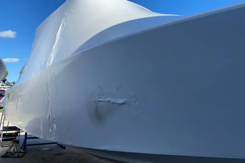 Factory options include: Twin Yamaha F350XSA4 V6 Outboards with Full Maneuverability including Joystick & Autopilot, Lewmar Bow Thruster, Bennett Trim Tabs, Electric Sure Shade Top, Ivory Bow Cover and Fusion Stereo.