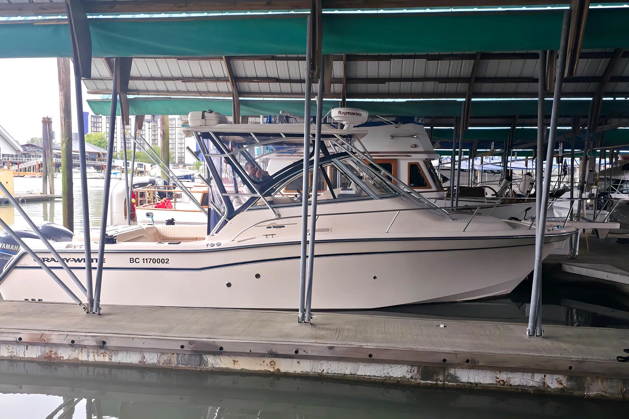 The spacious, climate-controlled cabin sleeps four, features a fully equipped galley, Vacuflush head, and all the amenities you need for comfortable overnight adventures. On deck, serious anglers will appreciate the 32-gallon livewell, 304-quart fishbox, and abundant rod storage.