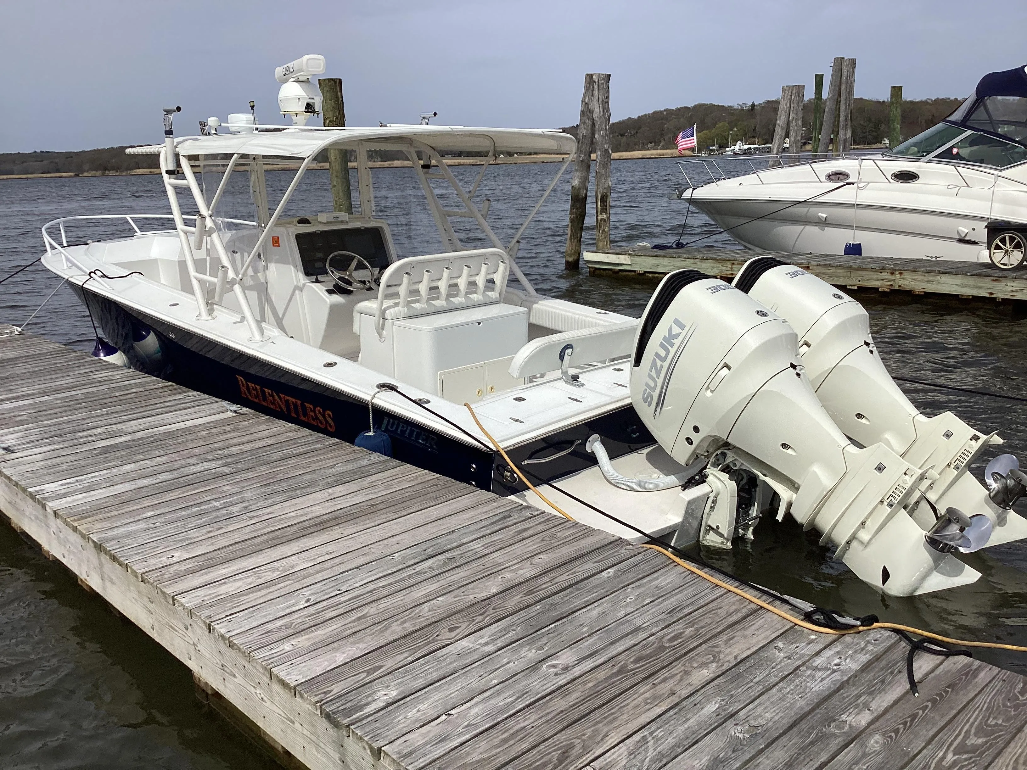 A hugely popular boat, the Jupiter 31 has ranked among the best boats in her class for many years. She was available in three configurations: open fisherman (pictured), cuddy cabin, and the popular forward seating model introduced in 2003. Originally a semicustom boat, the 31 is built on a high-performance deep-V hull with moderate beam, cored hullsides, and a solid fiberglass bottom. No wood is used in the construction, and the bottom has a keel pad from the stern forward for extra lift. The outboard bracket was beefed up in 2003 to handle today’s high-horsepower 4-stroke engines. Standard features include a transom rigging station with sink, transom livewell, lockable rod storage, fresh and raw water washdowns, roomy walk-in console with marine head and sink/ shower, in-deck fish boxes, leaning post with rod holders, in-deck dry storage, cockpit bolsters, anchor locker, and trim tabs. Tons of factory options were available. Note the Jupiter’s oversized console and spacious helm area. An iconic boat, over 1,000 Jupiter 31s are said to have been built during her production years. Mercury 275hp Verados del