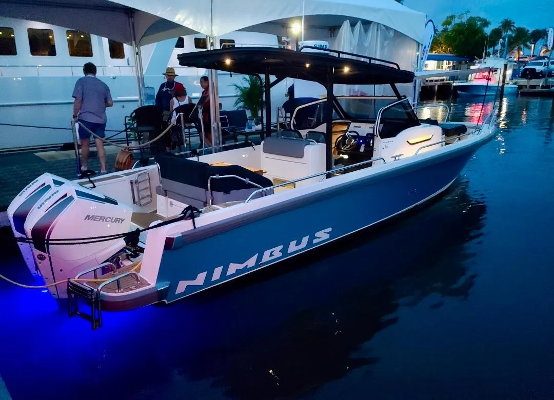 2021 Nimbus T9 X Edition, Twin Mercury Verado 225 HP. Dove Blue Metallic foiled hull.
