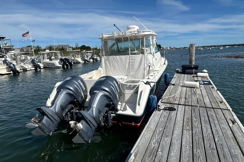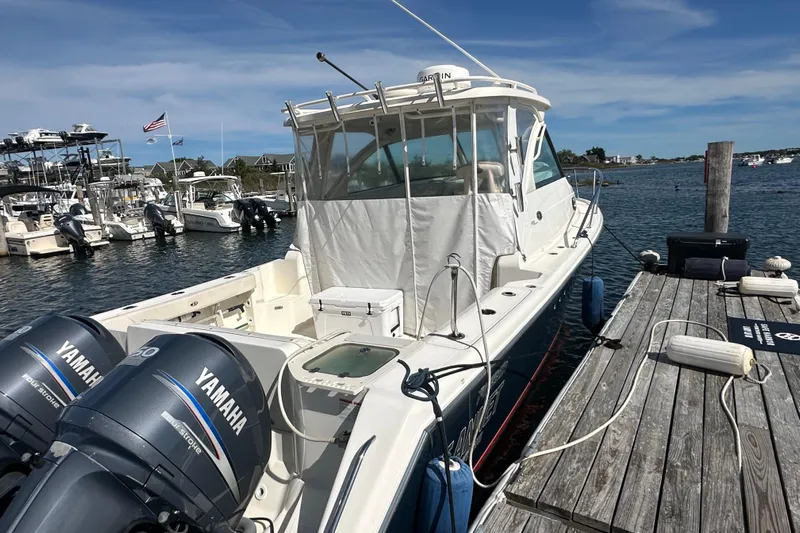 Introducing the 2010 Pursuit OS 315 Offshore, a remarkable saltwater fishing vessel that combines performance and comfort. With an overall length of 32.67 feet, this boat features a robust fiberglass hull designed in a deep v-shape, ensuring stability and agility on the water. Powered by twin Yamaha 250 outboard engines, this boat promises well-crafted design and powerful engines making it an ideal choice for those seeking adventure on the open sea.