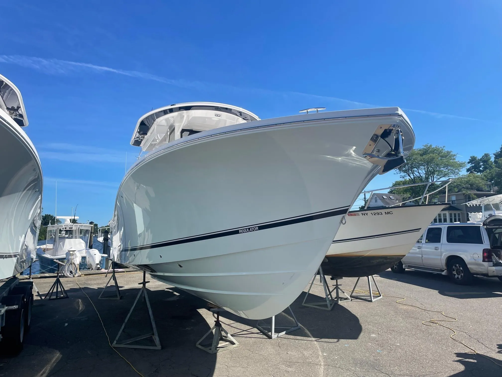 Pre-Owned 2025 Regulator 31 with twin Yamaha 450 HP XTO's with Yamaha Helm Master and autopilot. ONLY 150 ENGINE HOURS WITH YAMAHA ENGINE WARRANTY TILL 8/14/31. SeaKeeper Ride automatic trim tab option. Entire hull colored Abaco Sky. White Armstrong bracket with synthetic marine teak decking. Thru stem Anchor Windlass w chain. White Powder Coat Package. Carbon Fiber Edson Wheel with power knob. Fiberglass T-Top with a Flag Blue Underside. T-top rocket launcher. Spray curtain enclosure. Gemlux 22 Foot Carbon Fiber Outriggers. Forward Sunshade- Navy Blue. T top storage compartment. White upholstery package. 3X Tackle Center with mezzanine seating with SeaKeeper ready option. Garmin Offshore Upgrade Fantom 54 Radar. Entertainment package upgrade includes Fusion Dynamically calibrated system with 10 premium backlit speakers, subwoofer, Amps, External Antenna and Integrated Wi-Fi. Sirius GXM 54 Weather Marine Receiver. Inductive cell phone chargers- one at the helm and one in the console. Freshwater cockpit engine flush. Forward sunbed with filler cushion and convertible pedestal table. Bucket holder in the bilge with custom buckets. Additional forward rodholder package upgrade. A pair of transom rodholders. Hose coil racks for saltwater and freshwater washdowns. Sidescan sonar option. Cockpit rodholders. Electric head with holding tank. Courtesy lights. Helm, console and fwd console seat covers (Navy Blue). Fender pro cleats. Navy White Navy boot stripe. Call Michael Hayes for more information 631 921 9909.