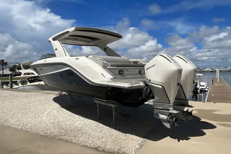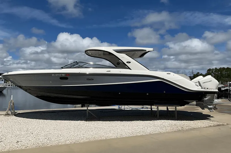 SALE PENDING Priced to be the next 310 SLX-OB to sell. Mercury 300's with Joy Stick Piloting and only 55 hours. Dry stored inside since delivered new. Three color hull: black, Searay Blue and Horizon. Premium stereo upgrade, twin 12" Simrad displays, opening canvas for hardtop, extended power sunshade, teak bow table, bow filler, dynamic running surface and more. This 310 is loaded. Please contact Listing broker Grant Droogsma 904-625-6146 grant.droogsma@marinemax.com There is a 699.00 brokerage fee paid by the buyer at closing.