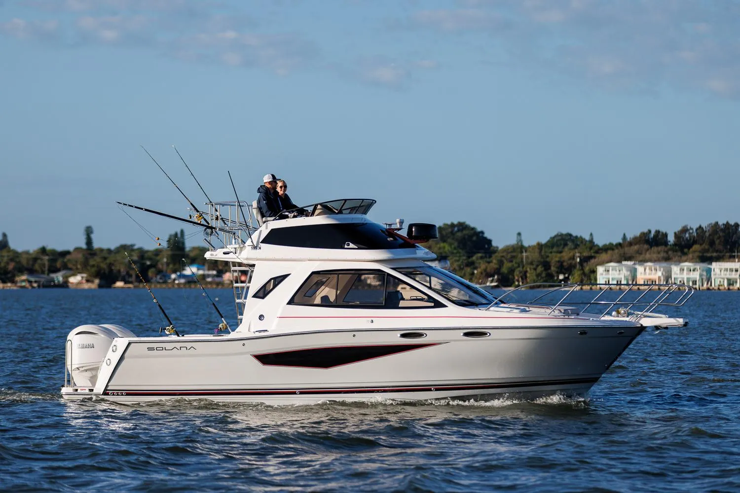 The cockpit is the heart of the action, featuring forward- and aft-facing transom seating, an opening aft bulkhead seat, and a clear-path swim platform with a dual-passthrough design for seamless movement. Whether gearing up for water sports or prepping fishing lines, the setup is built for ease. Rod holders, EVA traction decking, a raw water washdown, and optional outriggers ensure you’re ready for the big catch.