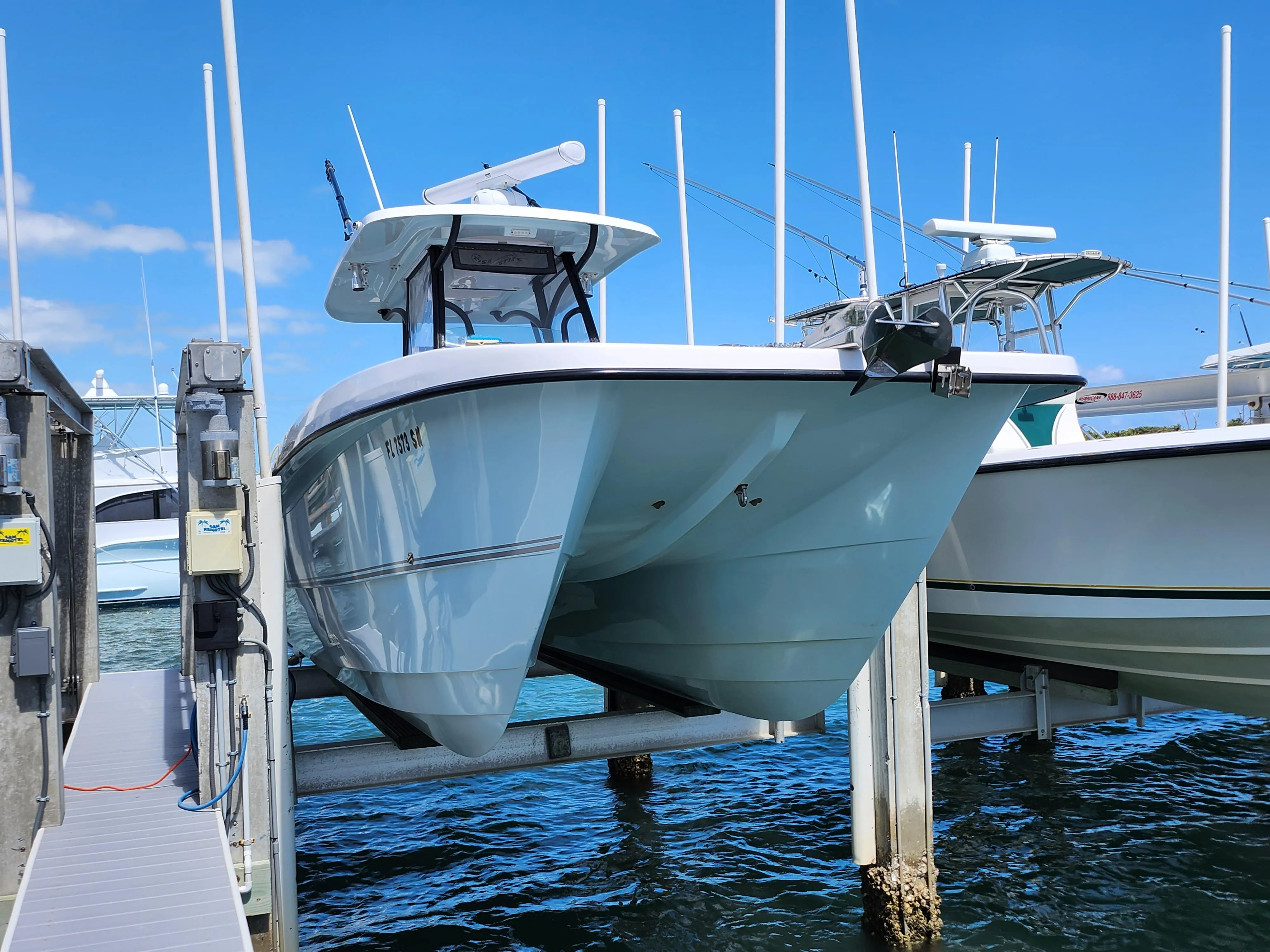This Twin Vee is located on a lift on the ICW at an exclusive private marina in Jupiter. The buyer has the option of taking over the lease.