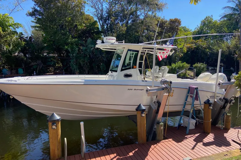 "MIMI" is our 2011 Boston Whaler 320 Outrage. She is lift kept with no bottom paint, and has been upgraded and maintained to the highest level by a very knowledgable boater. "MIMI" was repowered and upgraded with 2020 Mercury Verado 350's(less than 300 hours). Her electronics have been upgraded in the past 18 months with new Raymarine Axiom 2 pro 16" Hybrid touchscreens, a new Raymarine i70 Multifunction display for the autopilot, and a new Raymarine 63 VHF. Her cosmetics are excellent as she comes with a full storage cover. The engines were last serviced June 2025 at 200 hours. "MIMI" is truly turnkey and ready to be enjoyed by her next owner.