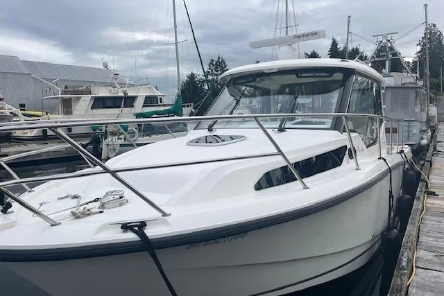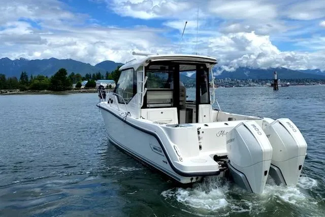 The Boston Whaler 325 Conquest is classy and sporty with a large cockpit for fishing and a classy interior for overnight stays or just lounging. The redesigned hull adds for more stability and performance. These boats are well equipped with fishing amenities like in-deck fish boxes and a dive door to the starboard side. The spacious cabin has a convertible V-berth and a midship spacious cabin. This model includes twin Mercury Verado 300hp engines with mostly trolling hours on them. Joystick Piloting and automatic trim tabs make it easy for cruising and maneuvering.