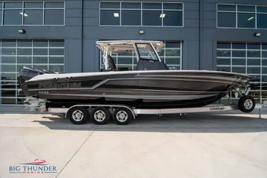 2022 Fountain 32NX, 2022 Fountain 32 NX Triple Custom paint matched Mercury 300R Verado's w/ DTS controls. 280 K-Planes. Bow thruster. Engine flushing system. Custom paint & graphics. Premium NX Sport upholstery upgrade. Lumitec Sea Blaze 2 RGB underwater lights. Bow seating w/ upholstered seat backs & bottom w/ storage. Folding transom bench seat. Cockpit side dive door w/ ladder. Electric SureShade. Screened portlight. Triple Garmin 8612 multi-function displays. Airmar B60 transducer. Premium JL Audio w/ Fusion RA770 touch screen entertainment center w/ built in WiFi, (6) 7.7 Spkrs. w/ custom painted grills, (2) 10" subs w/ custom painted grills, (1) 1500W 6 Ch amp & (1) 2250W mono block amp. XM Radio ready option. Wireless phone charging pad. Stainless steel steering wheel w/ "speed knob". Windshield wiper. Enclosed head w/ marine toilet, overboard discharge, fresh water glush & holding tank, fresh water sink. Fresh & raw water wash downs. Transom shower. Anchor windlass w/ thru hull striker plate, polished stainless steel plow, 15' of 5/16" galvanized chain & 150' of 5/8" 8-strand braided rope. Battery charging system. Trailer not included, new trailer quotes available separate. Financing and nationwide delivery also available, all 2010 and newer model year trades considered. Call for more info and demo scheduling.