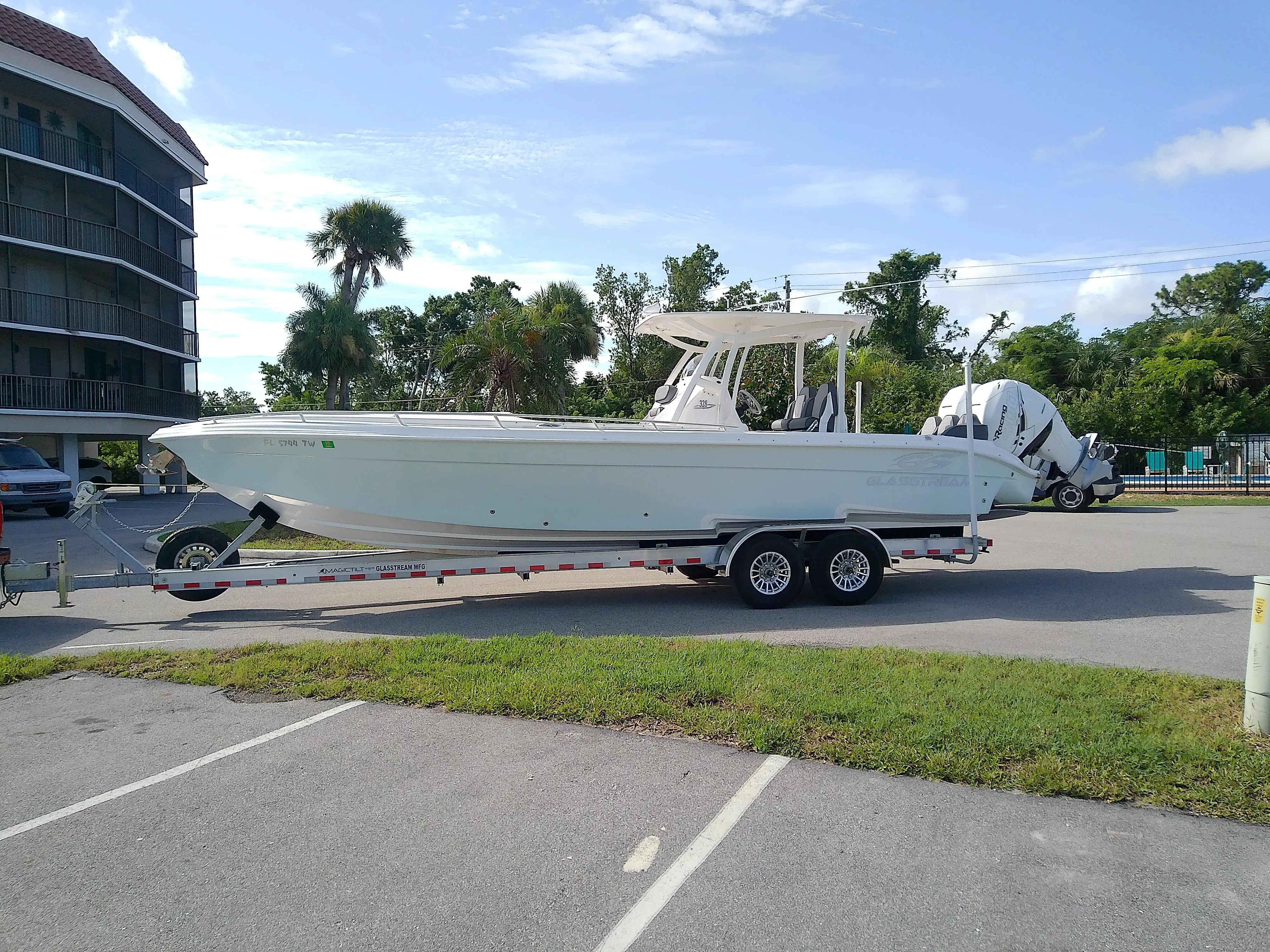 Very fast center console built for enjoyment and entertainment than fishing, but the fish can't tell the difference! The twin 400 racing engines will reach mid 70's top end and cruise you comfortably at 38 MPH. She has comfortable seating for 8 and sleeps two and has a very cool air conditioning set up. This is like the perfect Florida boat! Oh ... and a custom made 2025 Magic Tilt Trailer is included!!!