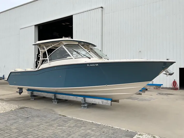 One owner originally sold by Marinemax. Always drystored inside. Under 180 hours on the Yamaha 300 HP outboards that does include the joystick piloting. Upholstery and exterior in A+ condition. Portside bar with refridgerator gives you that great cruising option on a very capable offshore fishing platform. Garmin electronics package, sureshade electric sunshade built into the hardtop, stbd side power sun lounger, marinehead with macerator and overboard discharge,underwater lights, clear curtains for hardtop and more.