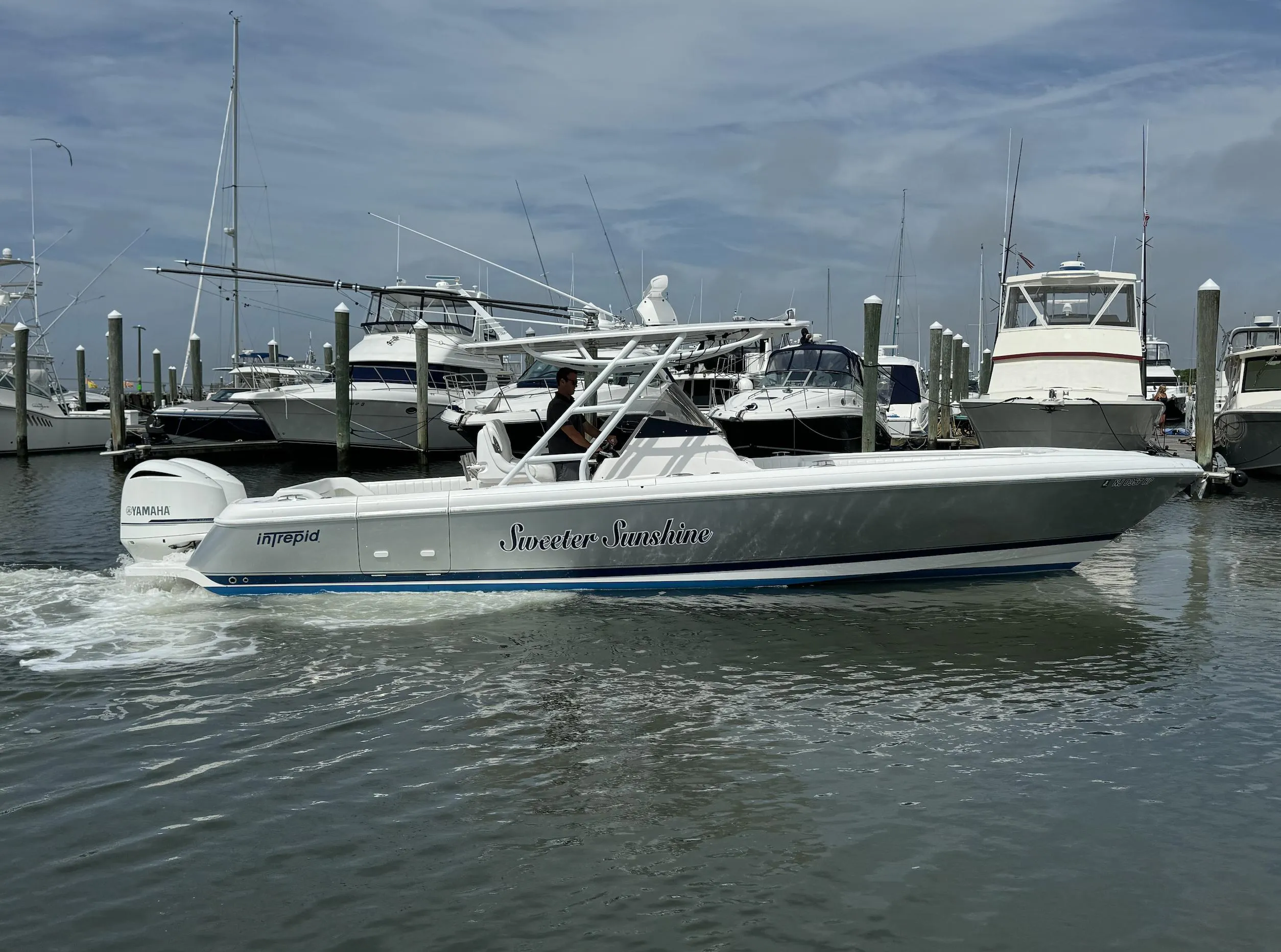 Intrepid Powerboats has always been known for its superior pedigree. As a semicustom builder from Florida, the brand is celebrated for its innovative design, fine workmanship, and reliable performance. Traditionally, Intrepid's are more often found as tenders for mega yachts rather than at tournament weigh-in docks. However, this is set to change with the introduction of the 327 Center Console. This model is fast, smooth-riding, smartly rigged, and highly fishable. Trophies and a devoted fan base are sure to follow. The 327 CC boasts a stepped hull designed to cut through waves rather than ride over them. Constructed with hand-laid PVC foam core and nonwoven multidirectional and unidirectional fibers, the hull is vacuum-bagged to minimize weight while maximizing strength. The hull's aggressive 56-degree entry angle tapers to 21.5 degrees at the transom, and with the integrated motor bracket, the 327 remains rock-solid even in rough seas, showing no signs of creaking or flexing.