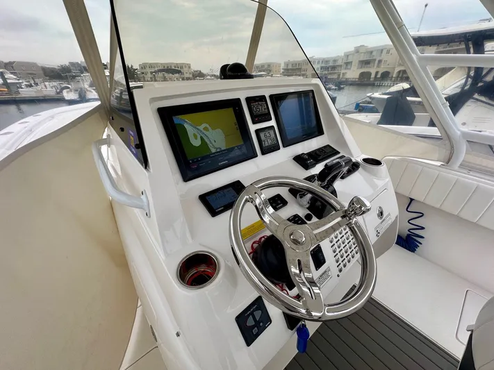 The 2016 Intrepid 327 Center Console is built to outperform and outclass, whether you're chasing pelagics offshore or hosting a sunset cruise with friends. Its legendary stepped hull delivers a stable, efficient ride without sacrificing speed or handling. The oversized hardtop with full-height supports gives serious coverage and adds that big-water capability you expect from Intrepid. With a spacious Cockpit, integrated dive door, and an arsenal of fishing features like outriggers, electric reel outlets and an in-deck livewell, it's tournament ready. Yet, with plush forward seating, an enclosed Head, and a removable aft bench, it transforms into a luxury platform for family cruising or serving as a yacht tender. Ample storage throughout means no compromise between rods, dive gear, or cruising supplies. This boat blends hardcore fishability with the comfort and finish that sets Intrepid apart.