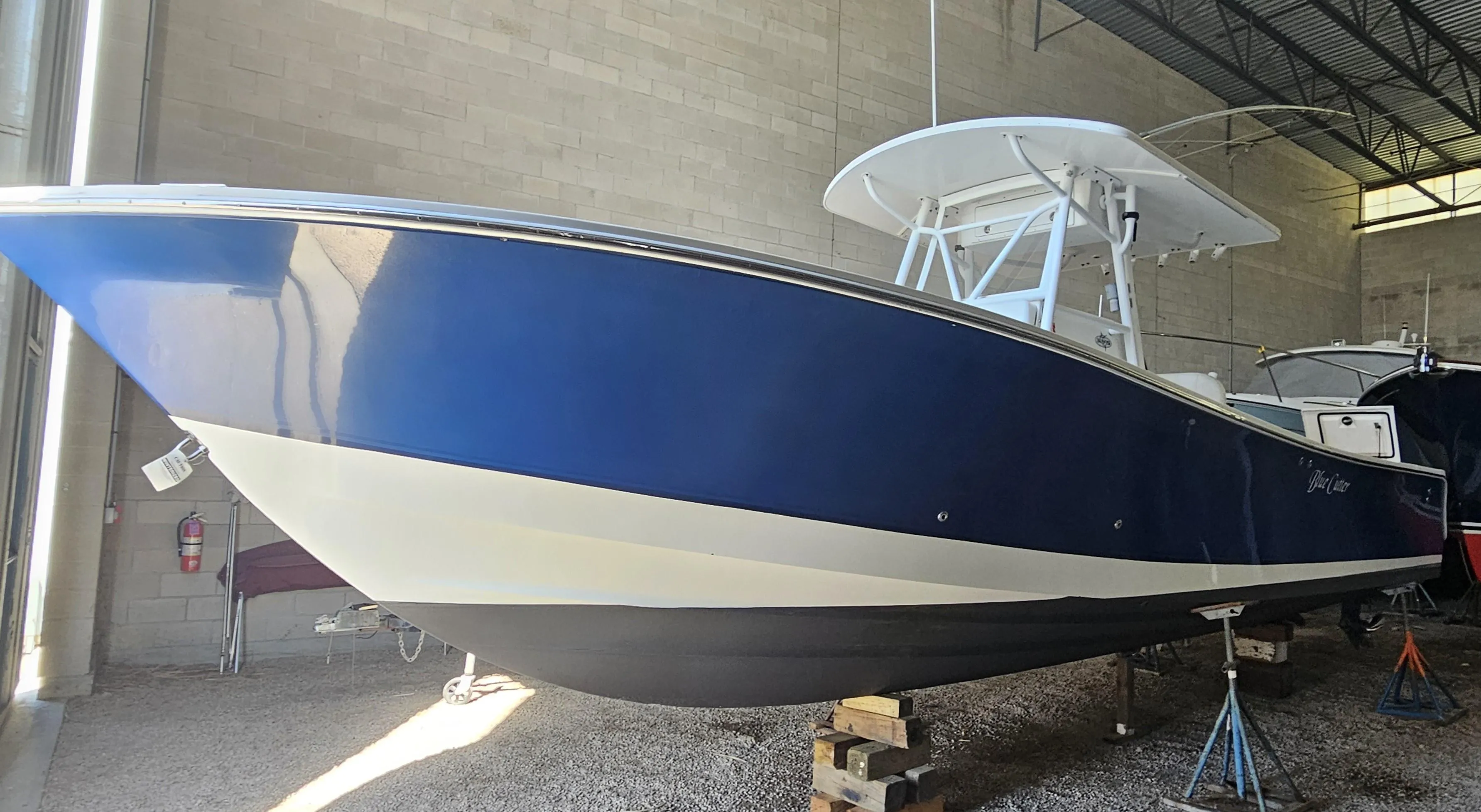 Powered by Twin 2014 300 Hp Yamaha four strokes with 1300 hrs and 100 service just performed. Features powder coated T-top, fwd seating with lots of storage, below deck bow storage, lots of tackle storage in/ around leaning post, transom seats, transom door, 'riggers, and swim ladder. Spacious head below the console. Electronics include 16" Simrad display, Simrad autopilot, radar, VHF, stereo, Lenco trim tabs and a windlass. Stored indoors for the winter. She's been waxed bottom painted, and engines commissioned. Needs interior detail and she'll be ready to go.