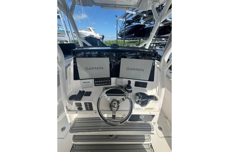 At the helm, you will find triple bucket seats with flip-down armrests and footrests for added comfort. Helm AC vents provide cooling during hot weather, while pull-up cleats help prevent line snags. A door on the port side of the console leads to a step-down cabin that includes an electric toilet, a sink with a pull-out faucet/shower, a Corian countertop, and a pad that can be used as a berth.