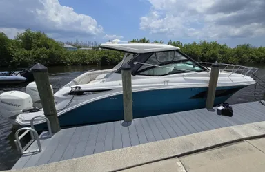 A cross between a sport cruiser and bowrider, the forward lounge seating design of the 320 Sundancer is unique in a boat this size. Accessed from a port walkway with two 6″ steps, the bow area features three individual, forward-facing lounge seats, each with an adjustable headrest and fold-down armrests. Cockpit features include a double helm seat with flip-up bolsters, an L-shaped settee with a removable table to port, a single jump seat abaft the helm, and a molded entertainment center aft of the jump seat with a Corian countertop, sink, refrigerator, trash receptacle and optional electric grill. Stowage is in the cockpit side panels, beneath the seats and in a deep transom compartment. A sun shade deploys from the hardtop to extend over the entire cockpit. Below, the 320 has a well-appointed cabin with an enclosed head and sleeping accommodations for four. In the aft cabin, sliding twin beds combine to form a queen bed, and the forward dinette converts to a V-berth. The mini-galley at the foot of the companionway steps includes a microwave and refrigerator.