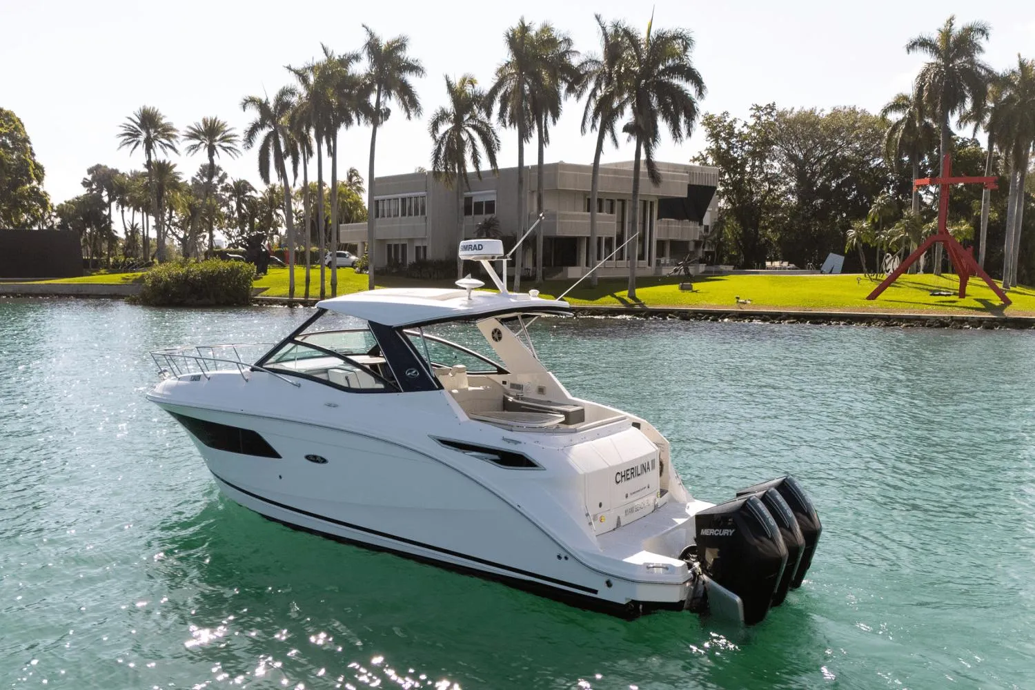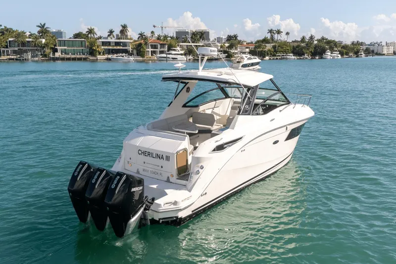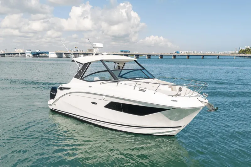 LOADED LOADED LOADED This impeccable one owner 32 Sea Ray Sundancer 2021 outboard is simply stunning! Only 150 hours on her triple Mercury JPO 250’s. She has the full electronics including twin chart plotters, autopilot, radar, VHF, upgraded stereo system, underwater lights and more. Your floating oasis is extremely comfortable with her generator, air-conditioned cabin AND cockpit, tons of seating and shade in both the bow and aft cockpit. Feel confident docking with the joystick and skyhook. She has every creature comfort for day boating as well as cruising with her refrigerators, grill, generator and sleeping for four. Not only is she fully optioned but she was just detailed, engines and generator services done and bottom painted. She is truly turnkey and conveniently located in Miami.