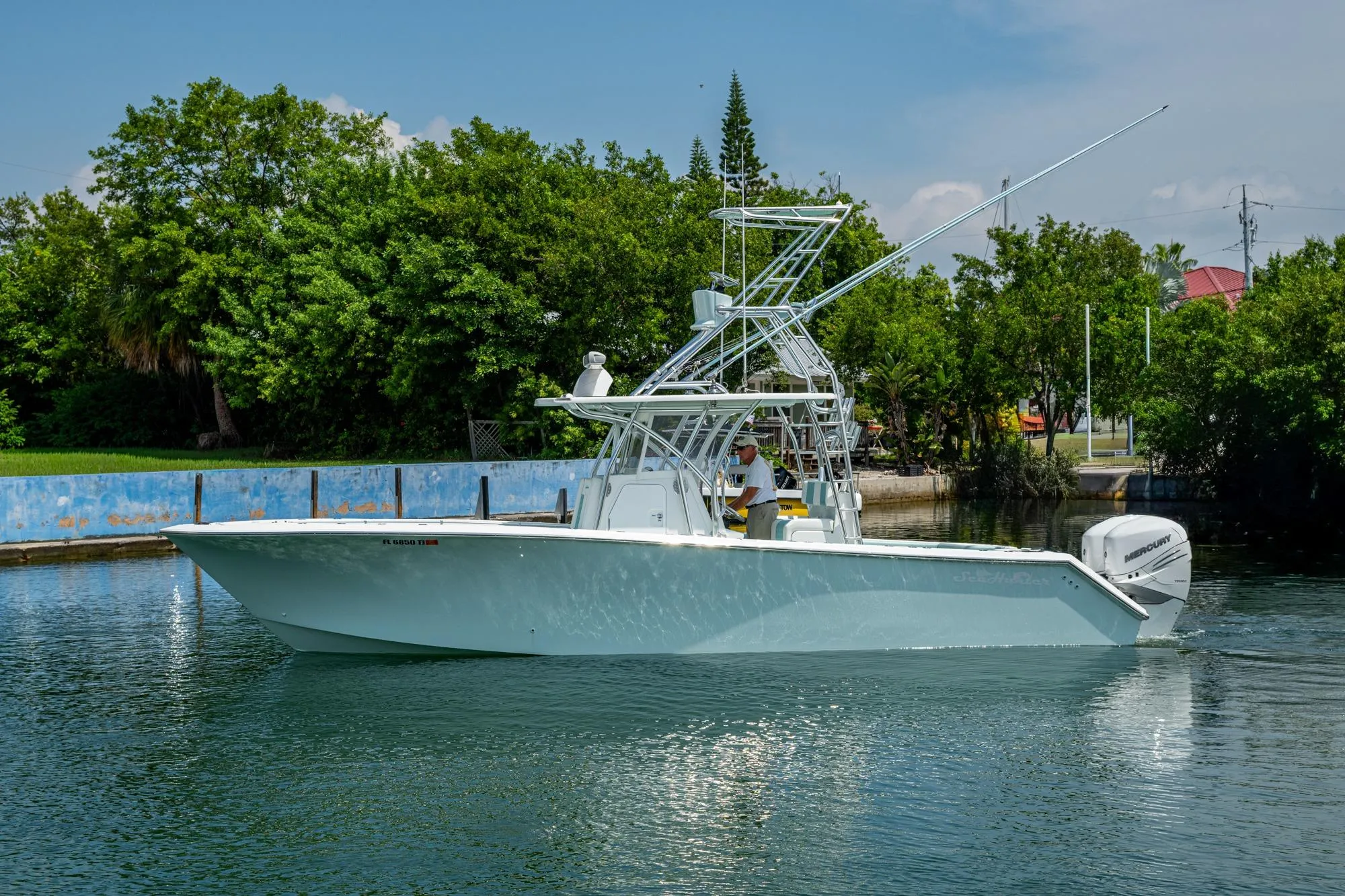 This 2023 31 SeaHunter was custom built by the owner with extreme thought to detail. Being a multi time Seahunter owner as well as numerous other high end center consoles, he knew exactly what he wanted and how he wanted it layed out. From its custom matching Aqua Mist hull colors in the fish box's and interior gunnels to the well thought out and highly functional collapsible tower with full controls and electronics, this vessel was built to do it all with a emphasis on live baiting in South Florida. 3 livewells with separate pumps ensure you can always carry enough bait with you and Her 49 Rod holders scattered thru out the boat means you always have someplace to put a rod.