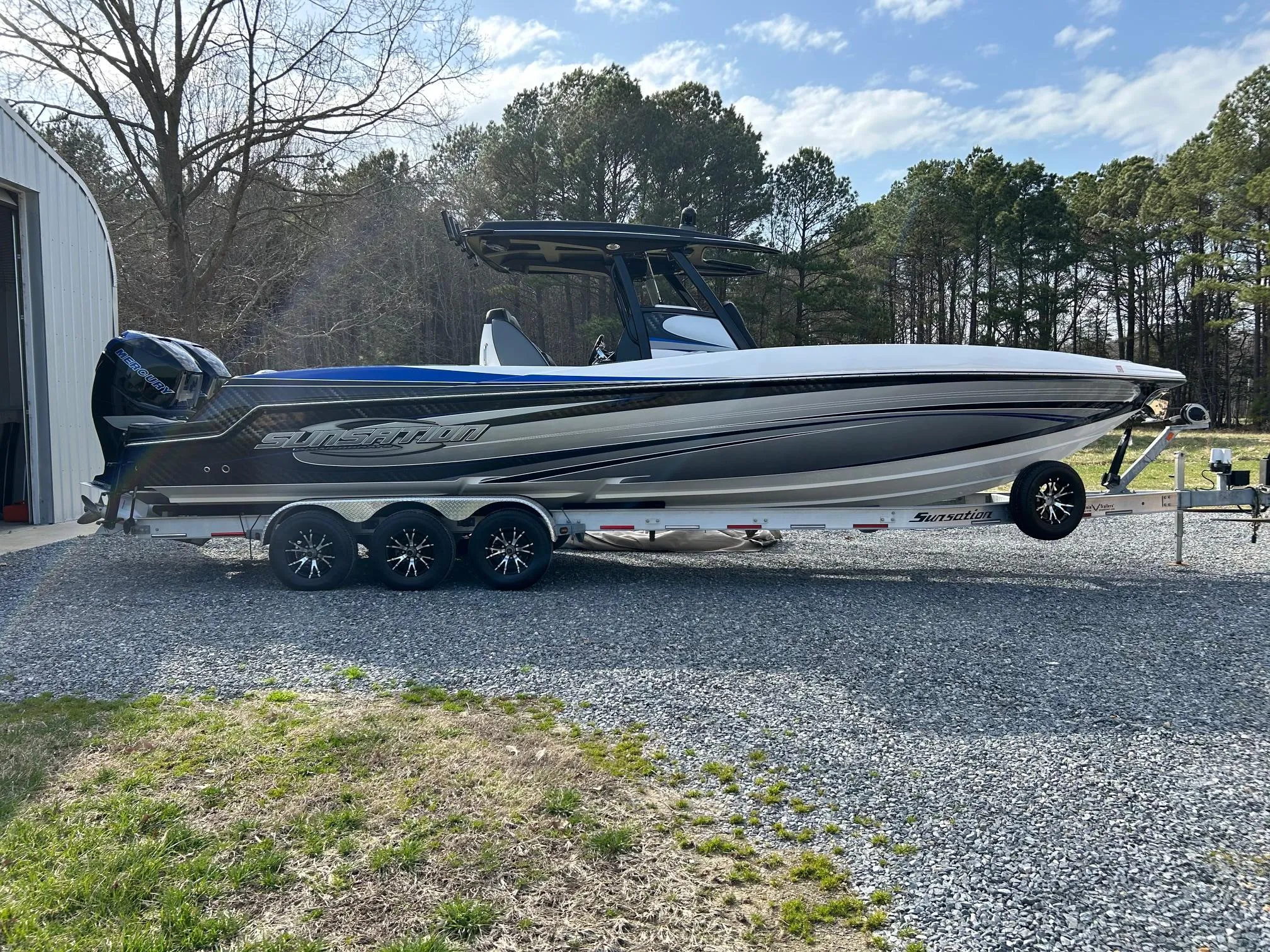 The 32CCX Center Cabin X-treme is in Sunsation’s line of high performance center consoles. This specialty center console has been designed to accommodate a wide variety of recreational water activities, while providing the speed and handling of a high performance V-bottom boat. The Tres Martin designed hull features the proprietary SS Taper Ventilation Technology, the latest advancement in hydrodynamic science. This boat is powered by twin 400HP Mercury Racing Verados. Standard features include twin heavy duty marine batteries, dual bilge pumps, trim tabs, six low-profile pop up cleats, deck rails, stainless steel rub rails, frosted cabin sky light, head and Fusion stereo.