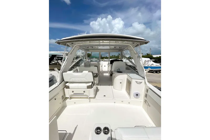 Joystick steering, diesel generator, air conditioned stateroom, head, helm with full Strata Glass enclosure and Electric Retractable Cockpit Sun Shade, Pool Style Dive / Swim Ladder, Live well Fish Box