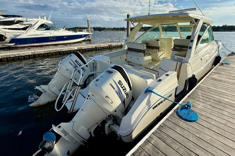 The 320DC has bow to stern amenities including fresh water wash down, double-wide port and starboard lounges, wrap around windshield, flat screen TVs, electric grill, food prep area and sink, two sleeper double berth and marine head just to hit the highlights. This boat is ideal for those seeking a blend of speed, stability and comfort making it a fantastic choice for both leisure outings or exciting excursions.