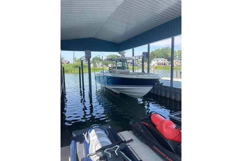• Freshwater system (40 gallons) with sink in console, transom shower and anchor washdown