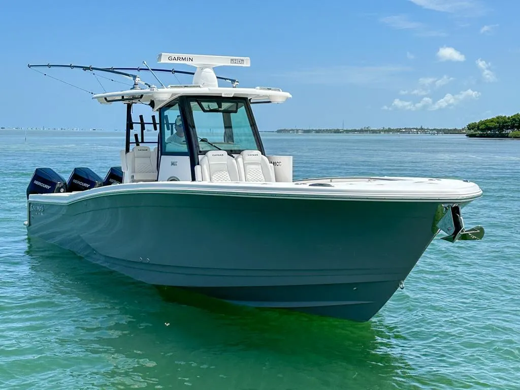 The Caymas 341CC is designed for serious saltwater tournament anglers as well as discriminating weekend fishermen and their families. Like all Caymas bluewater models, it features the patented Stepped-Vee Ventilated Tunnel (SVVT) Hull. Designed by Michael Peters, this revolutionary drag-reducing hull increases speed, enhances fuel economy, and delivers a remarkably soft, dry ride in heavy seas. Hard-core anglers will appreciate the 341CC’s innovative interior features. Integrated seats located in the boat’s massive bow can be deployed for passenger comfort while cruising, then folded while fishing for unrestricted deck space. A custom 70-gallon transom livewell features premium Hooker Electric pumps. Oversized fish boxes are located both fore and aft. Lockable rod storage provides security for expensive tackle. An innovative hardtop features a pass-through hatch, allowing easy access to the second station without compromising traditional rod holder placement and storage. An elevated helm station and driving position provides maximum visibility for safer cruising. With its roomy 10-foot beam and numerous creature comforts, the 341CC also provides a welcoming environment for family and friends. Amenities include a porcelain head with Corian® sink and forward chaise lounge seating with armrests integrated into the console that create a relaxing social center while cruising or enjoying the sunset.