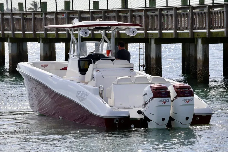 Turn heads on the water with this 2015 Deep Impact 33, a high-performance center console known for its aggressive stepped hull, speed, and smooth offshore ride. This boat is powered by twin Mercury Verado 350 outboards with approximately 800 hours, currently wearing 400R decals for a clean performance look. Motors are fully serviced and up to date.
