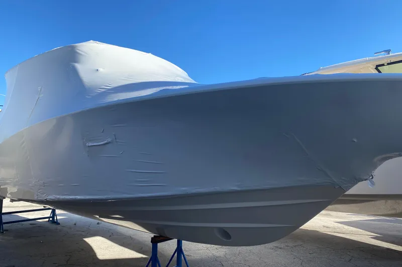 Factory options include: Twin Yamaha F350XSA4 V6 Outboards with Full Maneuverability, a Joystick & Autopilot, Deluxe Wet Bar with Refrigerator, Bow Thruster, Bennett Trim Tabs, Under Water Lights, Ivory Bow Shade, Ivory Bow Cover and Fusion Stereo.