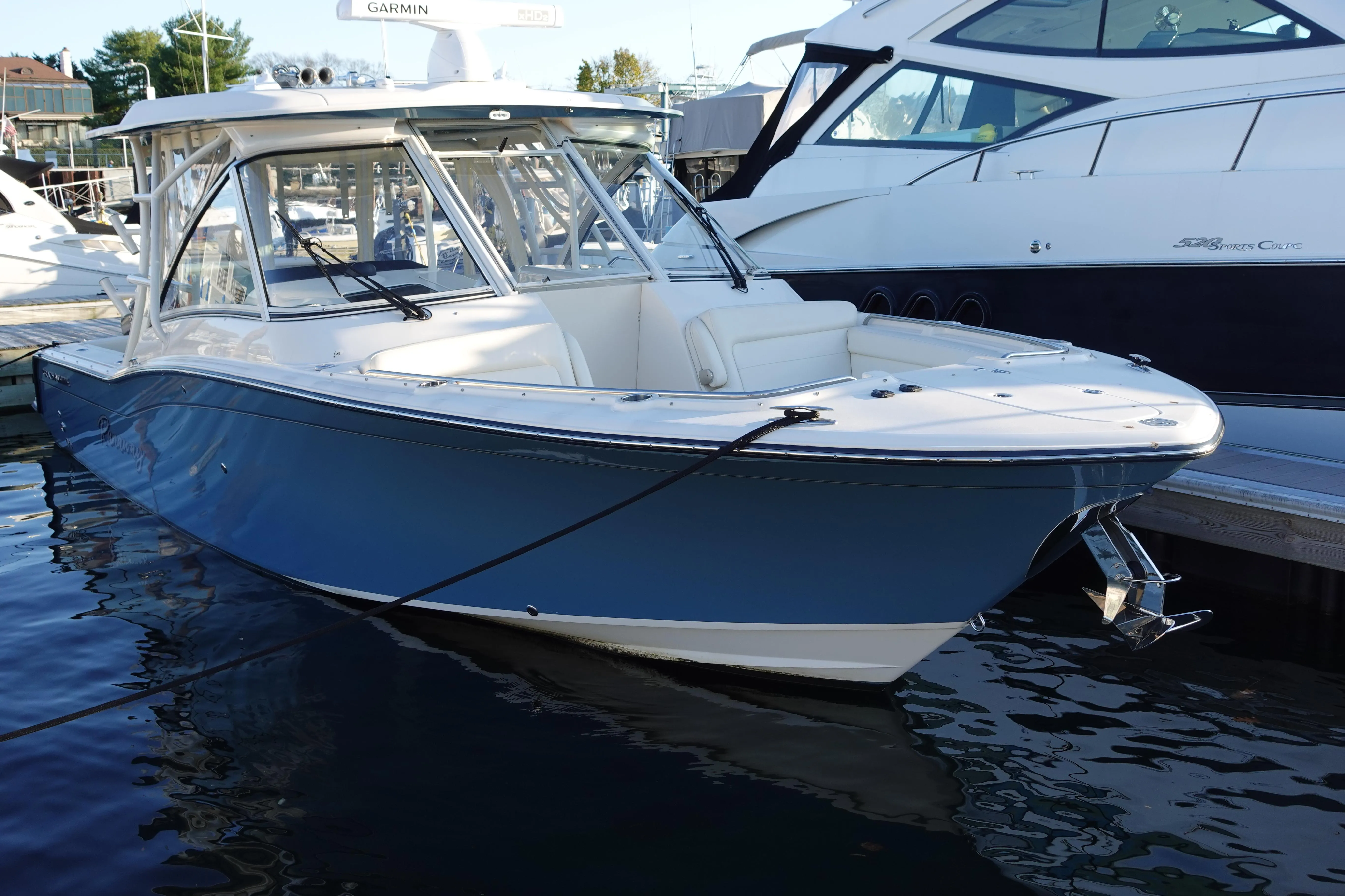 New to the market loaded ! Seaport Blue hull color, Twin Yamaha F-300 4-Stroke with very low hours (130), Air/Heat in cabin, Helm Master Joystick Steering, Electric Sunshade Canopy, Twin Garmin Touch screens, Auto -pilot, Dsl. Generator, Head, Hardtop with enclosure, Bow cover, Cockpit sink and frig. Remaining Yamaha warranty's and much more.