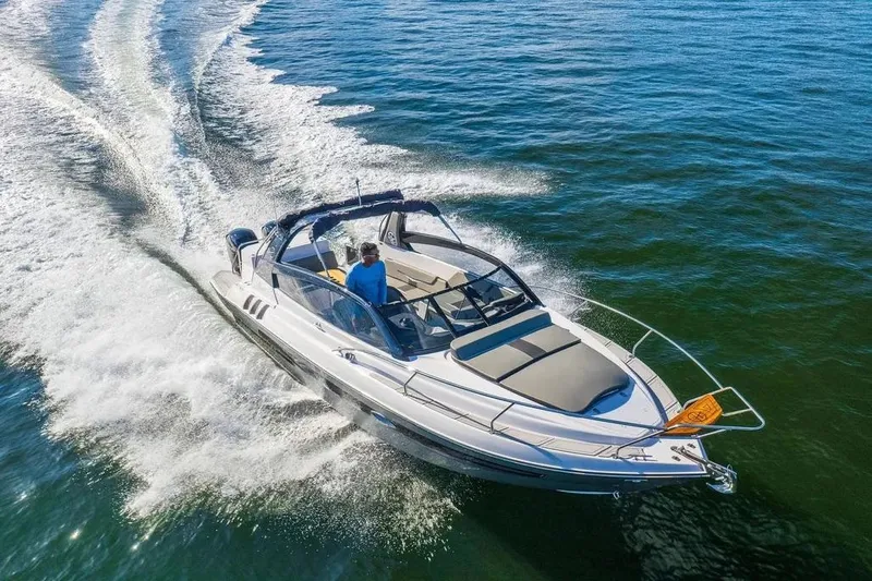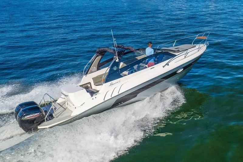 Hanover’s 305 blends sporty handling with versatile spaces. Wide walk-around decks lead you from the bow solarium to the aft lounge and hidden tender garage. An expansive swim platform and electric winch simplify water access, while Corvin-upholstered seating and teak accents set the tone for relaxation.