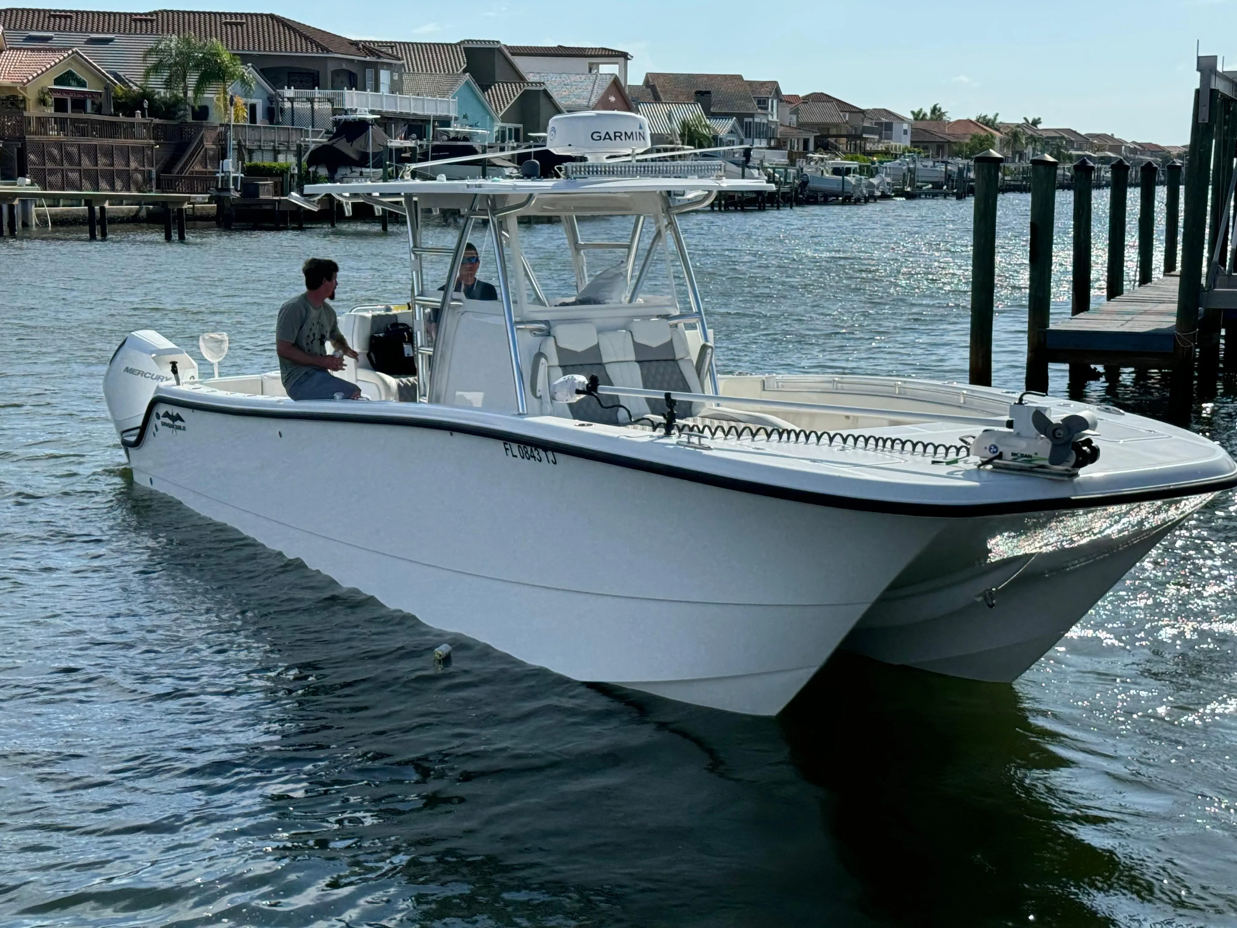 Powered by twin Mercury 300 V8s (with low hours), she cruises effortlessly through chop while maintaining fuel efficiency and comfort. The patented hybrid semi-asymmetrical hull design ensures a smooth, dry ride with incredible maneuverability and speed – even in offshore conditions.