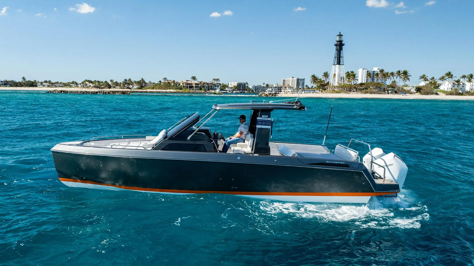 A unique and exceptional opportunity to own this LIKE NEW 2024 Schaefer V33, with full warranty and only 100 running hours. The vessel was delivered only 6 months ago and includes over $100,000 in options and upgrades including custom orange boot stripe on the hull and matching engine striping.