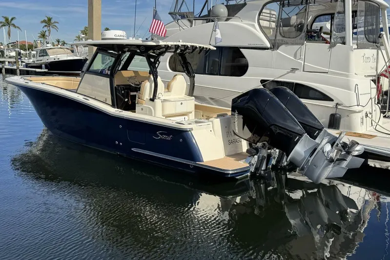 This Vessel boasts an expansive bow seating area with the diamond pattern Ultra Vinyl Upholstery upgrade (extremely soft to the touch), storage beneath the port, starboard and forward centerline seats, cup holders and additional storage compartments just shy of gunwale height and supported by gas shocks. Forward and aft sunshades supported by rod holder mounted stainless steel vertical poles. Armrests on both sides of the fwd console seat. Exceptionally large forward console seat with cushioned backrest and cavernous storage below. Additional Stereo Remote Control Panel to port forward of this console seat. Low profile mid-ship powder coated handrails port and starboard. Under gunwale rod storage on starboard side. Center console cabin is accessed from the port side. Cabin features include an electric head and fully cushioned berth large enough to comfortably accommodate two. The helm area possesses a powder coated T-Top with glass windshield forward and on both sides, (6) rocket launchers. Rope lighting makes for an impressive display during evening hours on the water. Acrylic dash is ergonomically designed making the respective MFD's easy and efficient for the captain to view when under way. Full digital switching. Helm and companion bolstered seats include armrests with a glove box centered between the seats. Epoxy Infusion lamination process eliminates port-cure hull creasing and pre-release lift areas resulting in a beautiful smooth surface void of inconsistent patterns. Dive Door to port just aft of the helm with dedicated recessed storage for the dive door ladder. Leaning post includes 3 tackle drawers to port, a YETI 65 qt, slide out cooler and counter top sink to port and a cutting board to starboard. Folding centerline cockpit transom seat and elevated circulating livewell to port side of the transom. Starboard side transom door. Cockpit and midship bolsters in matching canvas upgraded fabric. The Scout 33LXF is built to "Yacht Class Certification" standards.
