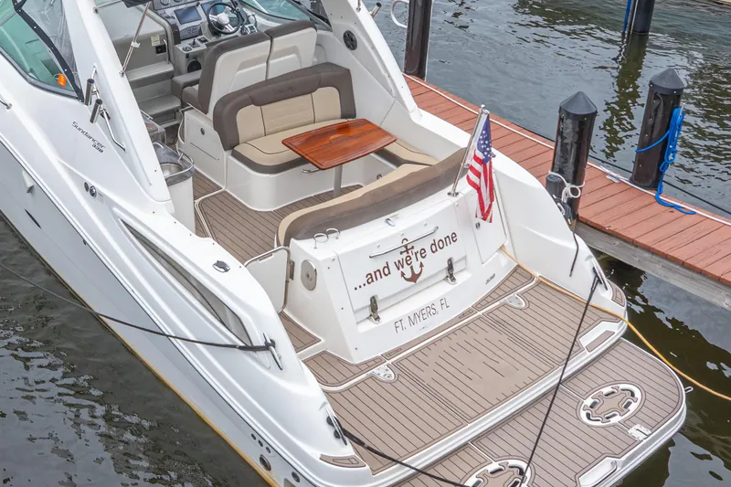 The onboard Kohler generator with only 226 hours ensures self-sufficiency while underway or at anchor. This Sundancer is also equipped with a bow thruster, SmartCraft system, Raymarine Axiom electronics powered by Lighthouse, and a flood light for optimal navigation and docking. The bottom was freshly painted in 2023, and new bilge pumps were recently installed—demonstrating a consistent commitment to maintenance and upkeep.