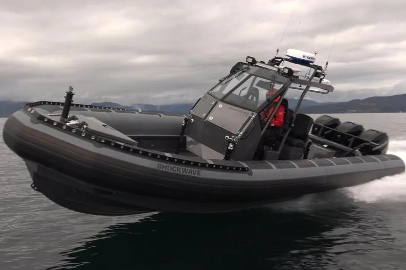 Built 2015 by Titan boats (Sidney B.C.) for Shockwave, maker of professional marine suspension products. This boat comes equipped with the Shockwave ICE (Integrated Control Environment) console: 'a suspension module that suspends occupants, controls and electronics inside a single unit. Manufactured in Canada, its triple-axis design provides protection from wave impact in all directions, providing occupants increased safety and ability to travel in extreme conditions.'