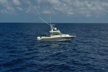Loaded with desirable options, she features air conditioning, generator, premium audio, underwater lights, and full canvas enclosure. The helm is outfitted with Raymarine electronics, radar, and autopilot, while the cabin provides a galley, enclosed head, and comfortable berth for overnight stays.