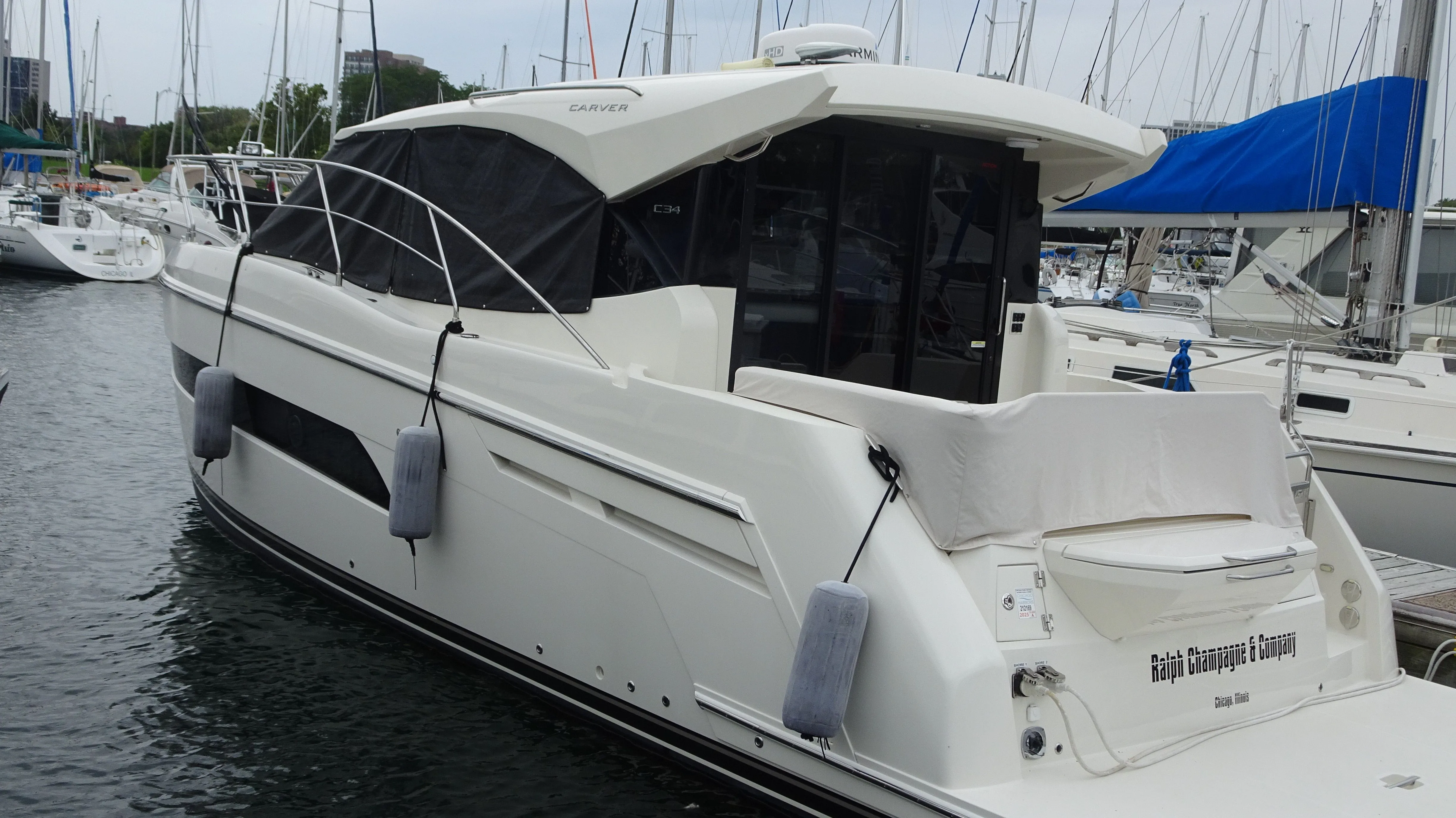 2018 Carver C34 in excellent shape. All fresh water and has only been on Lake Michigan. This yacht was sold new by this listing broker. The photos were taken (9-3-2025). This boat has been meticulously maintained and shows like the photos. The 1st owner traded up in 2018, the second was an elderly man who enjoyed the marina lifestyle and only a captain skippered the boat for him and the current owner kept the boat in Chicago and he and family enjoyed light use.
