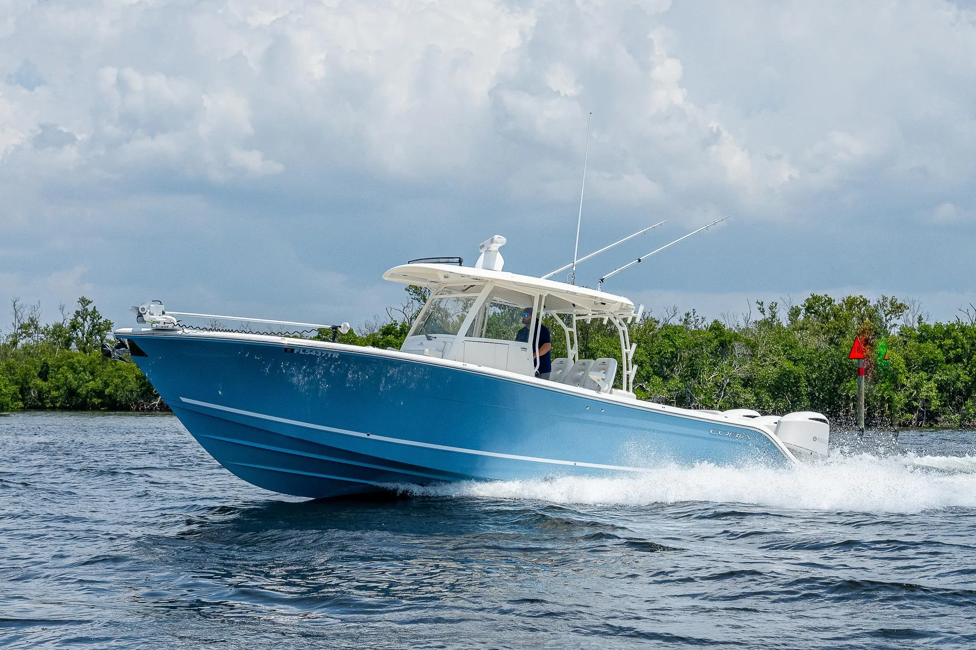 A stunning 2021 Cobia 350 Center Console, equipped with a Triple Yamaha F300 engine package. This vessel features Yamaha EX Helm Master with Autopilot, twin 16" Garmin MFDs, VHF radio, Open Array radar, Rhodan trolling motor, bow shade, outriggers, a head, and the optional cockpit refrigerator. Fully loaded and in pristine condition, this boat is ready to go and requires no additional work.