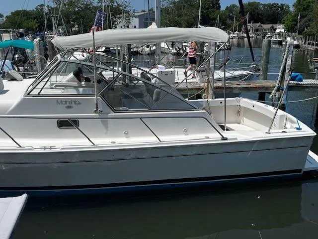 The Mainship 34 has the traditional (Downeast) express layout with the primary stateroom forward with the louvered opening doors to the main salon for great ventilation.  Aft to starboard is a large sized dinette that drops down to create a double berth.  Across to port is the straight line galley with stove, microwave, sink and refrigerator.  Aft of the galley is a large head with an electric marine toilet and shower. This Mainship has wide walk around side decks with high rails.  There is a transom door for ease of boarding.  This vessel is very economical and ready to Fish or Cruise!