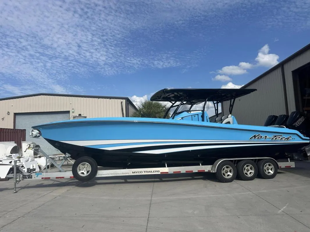 2025 Nor-Tech 340 Sport. Powered by triple Mercury Racing 400R V10's. Big option list including Zero Effort Controls, Club Sport rear bench, twin Garmin 8622 GPS, Big JL Audio stereo, VHF, transducer, bow thruster, big paint upgrades, largest available all JL audio sound system including backlit speakers, Sea Dek, Black Oak LED light bar, fresh water flush, flush toilet/macerator, retractible boarding ladder, windlass, electric bow table/lounge, Sea-Dek, forward facing backrests in bow, hexagon interior, large t-top and much more. The black gel bottom with the Lamborghini Urus blue paint makes this one a showstopper.