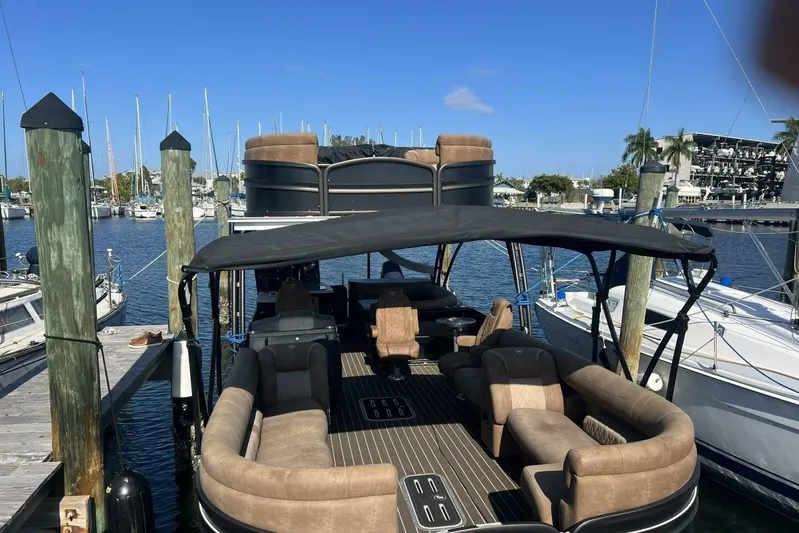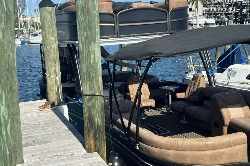 This highly upgraded 2023 Premier 330 Escalante combines luxury tri-toon cruising with serious performance. Powered by twin Suzuki 350 HP outboards and featuring Premier’s premium PTX Performance Package, this model delivers superior handling, stability, and acceleration compared to standard tri-toons.