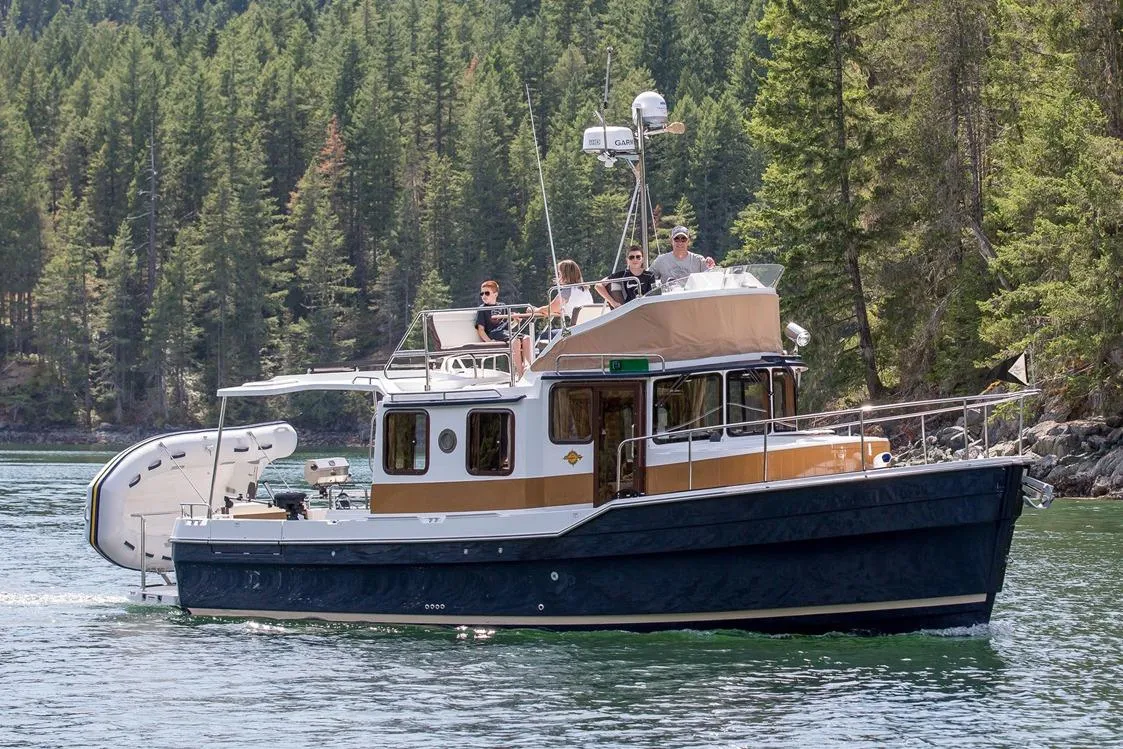The R-31 CB shares many of the features and qualities of her smaller sisterships but some notable additions to this larger model make her ideal for extended cruising while still being a trailerable trawler. The R-31 CB was the first Ranger Tug to lecture a flybridge equipped with electronic controls at both the upper and lower helm. The flybridge also retracts to allow for trailering the 31'. The builders at Ranger Tugs also equipped the foredeck with seating and a table that can be raised or lowered depending on whether the boat is under way or at anchor or dock for entertaining. In addition to the extro seating on the flybridge and foredeck the R-31 CB allows for a larger cockpit area with wraparound seating and extra seating that folds out of the gunwale. When not entertaining, seats are folded leaving the cockpit unencumbered. The interior layout of the R-31 CB features two staterooms-one large island berth forward with en suite head and a midship berth and day head. Those who are familiar with Ranger Tugs models will recognize the galley layout and lower helm station that maximize interior space. A starboard side door provides easy access from the lower helm to the side decks so crew can get to the bow for line handling. Like oll Ranger Tugs, the R-31 CB comes turn-key with standard features and equipment intended to make her owner's experience hassle-free and allow for ease of handling and comfort under way. Standard equipment includes bow and stern thrusters and a Volvo D4 320 HP engine that achieves a 16 knot cruise speed.