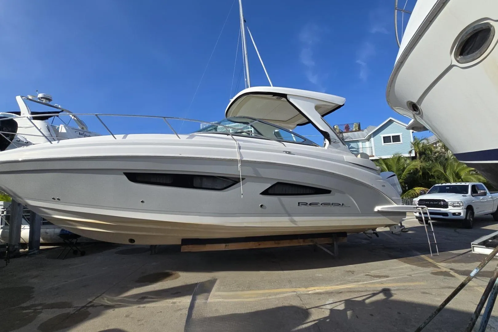 The Regal 33 OBX is the outboard version of the company’s sterndrive-powered 3300 bowrider. With her spirited outboard performance, the OBX caters to boaters and families whose interests are coastal cruising while still having the ability to participate in skiing, diving, or wakeboarding. The open seating plan of the 33 OBX is similar to most big bowriders with comfortable bow lounges, double-wide helm and companion seats, and L-shaped seating in the cockpit. A refreshment center abaft the helm seat features a refrigerator, sink and grill TV. Instead of a pair of V-8 engines under the deck, the OBX has a massive storage lazarette for stowing a ton of gear. The head compartment is finished with black cherry cabinetry, and a queen bed is tucked under the cockpit. Overhead, a retractable sun shade built into the hardtop extends out over the cockpit. The backrest of the transom lounge can be adjusted to several positions. Outboard power allows the 33 OBX to easily explore shallow-water bays normally off-limits to sterndrive boats. A quality boat from a company that gets things right, twin Yamaha F300 engines cruise economically at 30 knots.