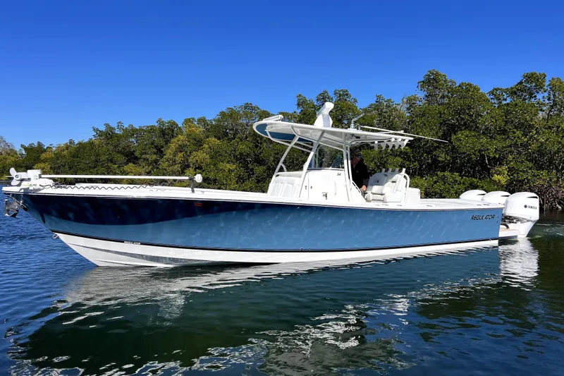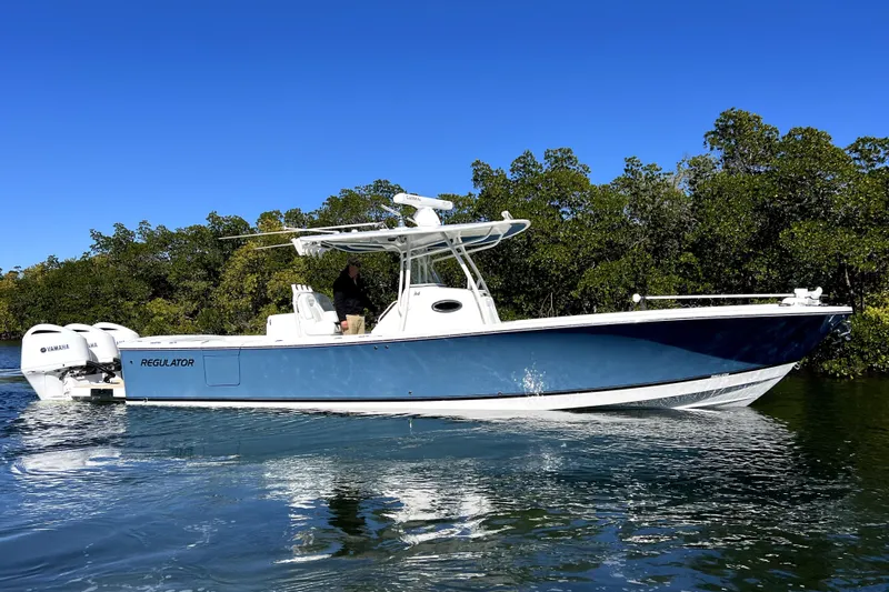 The 34 Regulator is a purpose-built offshore center console known for its exceptional ride quality, tank-like construction, and serious fishability. This boat is an exceptional example. One owner boat that has been lift kept with an open check book since day one, with full service records. This boat just received a full 3 step detail from the top of the T-top to the bottom of the keel and everything in between; there is not a square inch without a fresh coat of wax. Stand out features include NEW Garmin 8616's, Rhodan trolling motor, Windlass anchor, light bar, and much more. From the charging ports and cupholders next to the forward seating, to the massive berth and cabin downstairs, this boat offers all the amenities you could ever imagine. Along with the amenities, the giant live well and big fish boxes are where the fishing DNA truly shines through. A true multi-tool, this boat accommodates everything from the sandbar to 100 miles offshore and anything in between. See full MSRP sheet in photos.