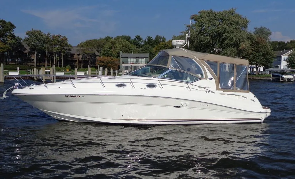 A Super clean and Shiny example of a later model, Freshwater 340 Sundancer......and yes, she does have the optional Mercruiser 8.1L Horizons and a Generator! A Very popular boat in the right condition with all the right options! This boat was recently professionally buffed and waxed and has new top and front canvas! This boat is clean throughout and offers a Cherry interior, Custom SeaDek on the swim platform, New Raymarine Axiom Radar/Plotter, New VHF Radio, New Style SmartCraft Display, New Cockpit Refrigerator, Bow Sun Pad, Upgraded stereo with Amp/Sub and 2 cockpit remotes, Large Flat Screen TV in the salon and much more! The Merc 8.1's have 921 hours and the Generator has 395 hours. The later model 340 Sundancer's offer a wider 12' beam, Very comfortable cockpit arrangement and a spacious and open cabin. This is a boat that we are personally very familiar with and have a lot of confidence in. This boat is inside heated storage, in Fantastic condition and is a pleasure to see! Call or email us for all the details.