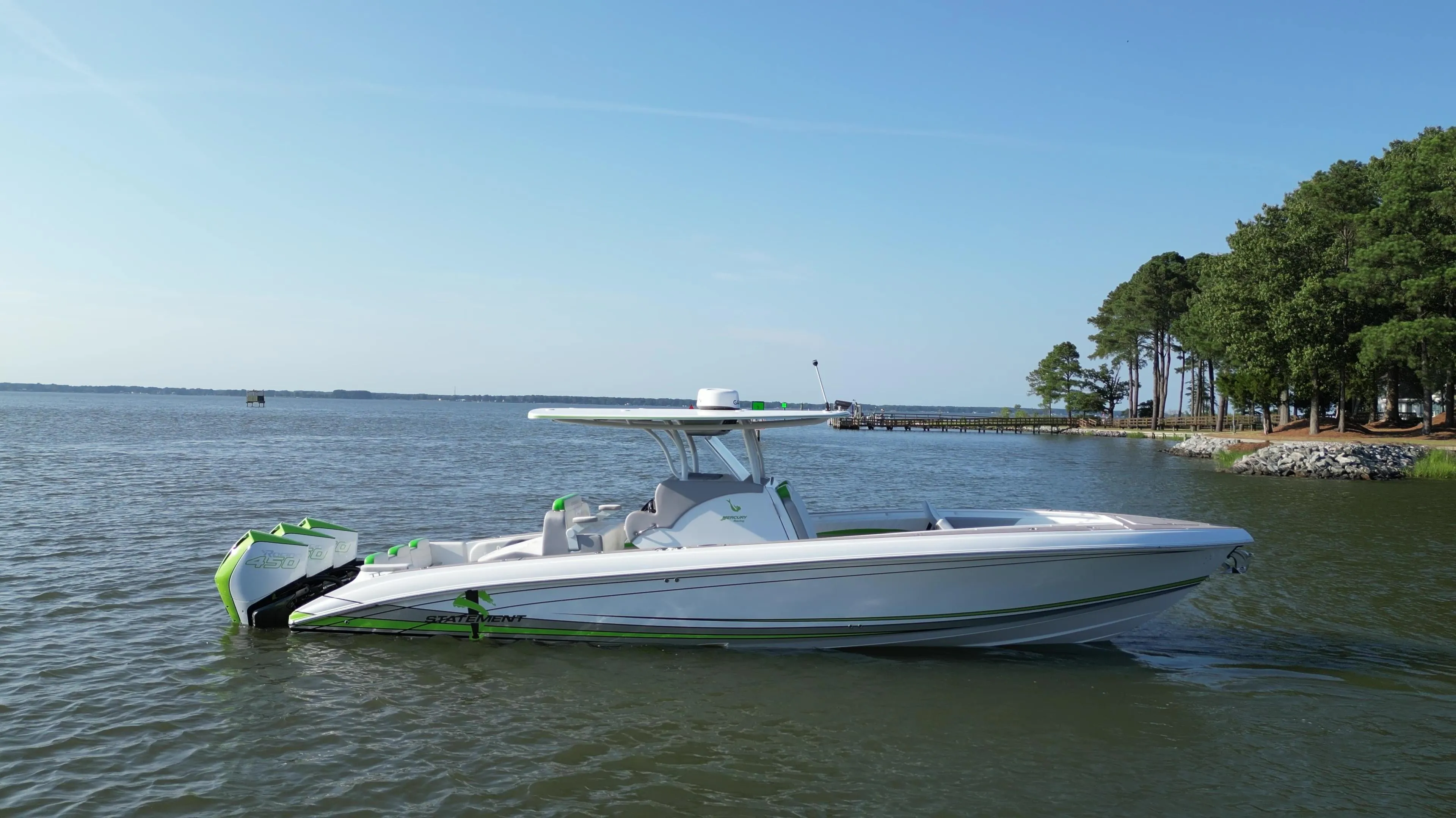 From large lakes to the turquoise waters of the Bahamas, the 350 Open is your perfect boat for any fast-paced day on the water. Equipped with triple 450 Mercury racing outboards, JL Audio sound system, Garmin electronics, and fully ceramic-coated, Statement boats blend performance with luxury, ensuring you arrive at your destination swiftly and in style.