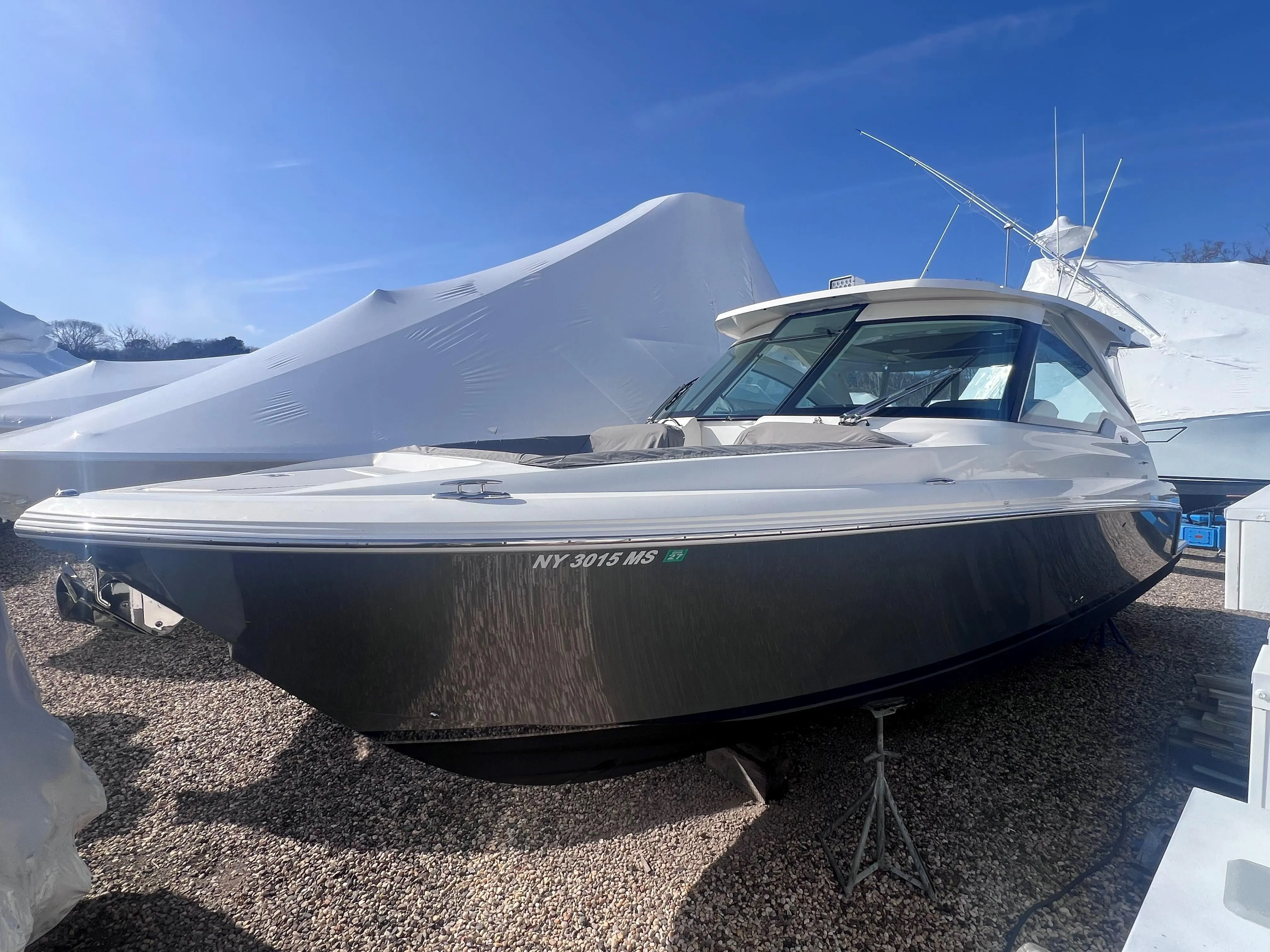 CANVAS: Bow seating weather cover, aft cockpit retractable sunshade, Aft cockpit seating weather cover, helm surface and helm seating weather cover, TV Cover, side and 3-piece aft enclosure.